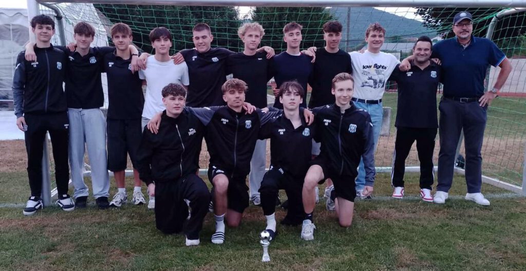 Unsere U19A-Juniorenmannschaft beim Hans-Görgl-Cup 2025 – hinten von rechts nach links, GJL des SVN-R Michael RICHTER und Trainer Roland HAFNER