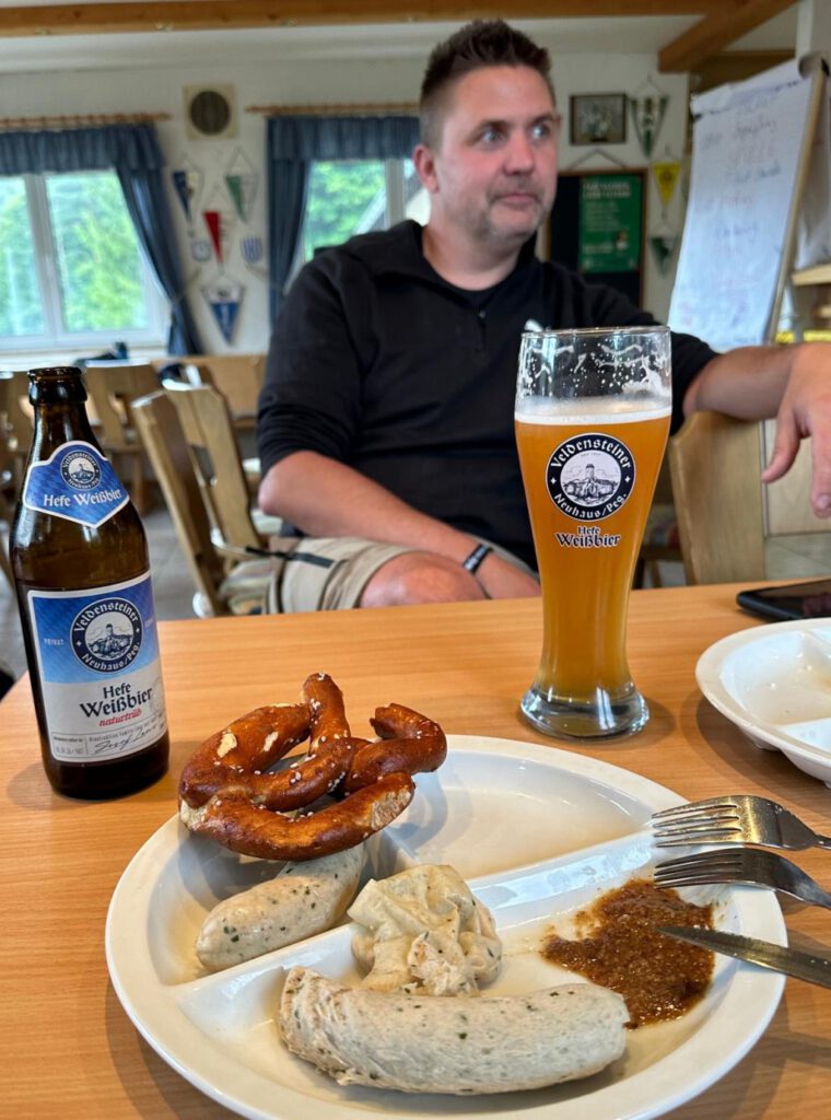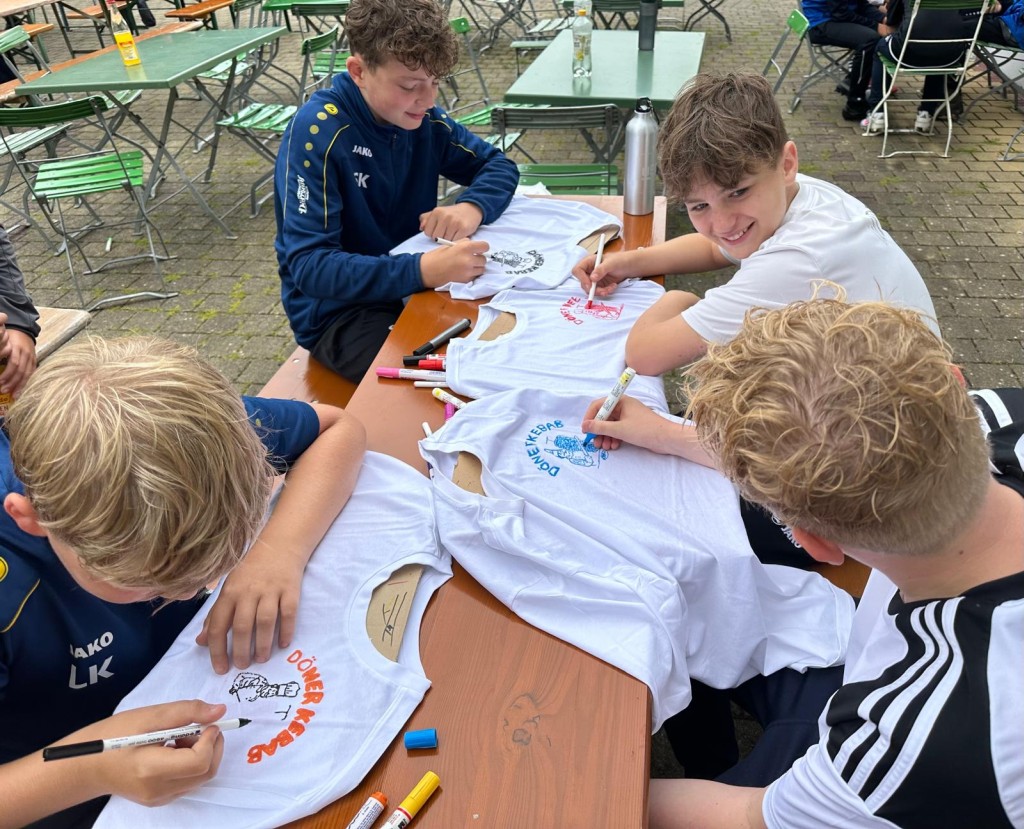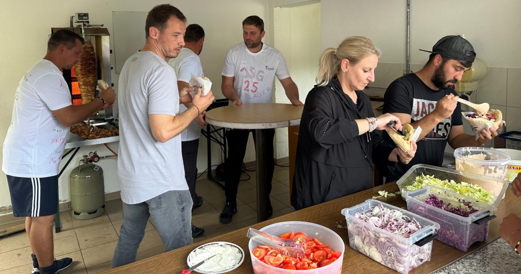 Die Idee und die praxisnahe Umsetzung des gemeinschaftlichen Eisessens – so die Aussagen der Kinder – war ‚unschlagbar‘. Bei unseren Betreuern reifte bereits in dieser kurzen Einkehr der Gedanke, dass Zeltlager auch für das nächste Jahr zu planen und durchzuführen, in der Hoffnung, dass die Wetterprognose besser sein wird und dann auch tatsächlich gezeltet werden kann. Auf der letzten Wegstrecke zur Waldsportanlage, war bei den Kindern die Vorfreude auf das Döneressen spürbar. Unser Sportfreund Aziz hatte mit seinen Helfern bereits zur frühen Nachmittagsstunde mit den Vorbereitungen begonnen und die Ausgabe der Döner – mit unterschiedlichsten Soßen und weiteren Zutaten – lief größtenteils wie am Schnürchen. Da es dem einen oder anderen manchmal doch etwas zu schleppend voran ging, hätte man(n) meinen können „Ungeduld ist mein zweiter Vorname“, aber die Ungeduld ist durchaus bei bestimmten Anlässen und in bestimmten Lebenssituationen, ein Privileg der Jugend.