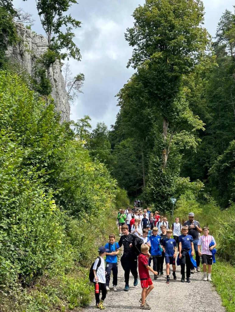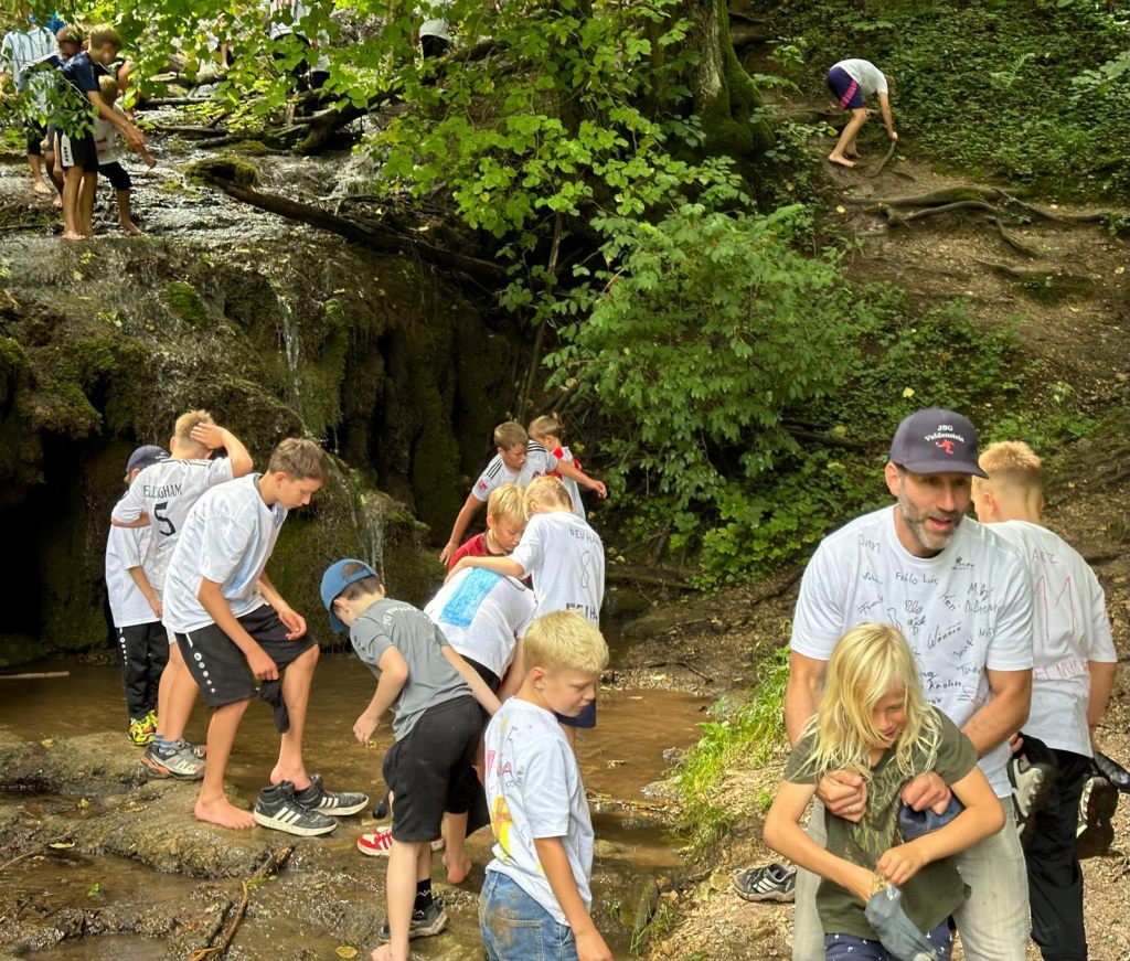 Die von Elmar zusammen- und vorgestellten Spielstationen wurden – je nach Neigung und Interesse der Kinder und auch Erwachsenen – sehr rege, und z.T. im Wettbewerb, angenommen. Der gesamte Tag stand für unsere teilnehmenden Mädel‘s und Jung‘s unter den Aspekten, Spiele hier nicht nur Fußball, sondern habe Spaß in der Gemeinschaft mit ein wenig Abenteuer, sowie viel Bewegung, um die eigene Geschicklichkeit auszuprobieren. Sehr guten Anklang fand bei unseren Kindern u.a. auch das Bemalen bzw. Gestalten ihres eigenen T-Shirts. Nach diesem ereignisreichen Vormittag stand das gemeinsame Mittagessen an – Kerstin hatte Nudeln mit Pasta vorbereitet – und kaum aufgegessen, kamen schon die ersten Fragen „.. und wann laufen wir zum Wasserfall los? ..“.